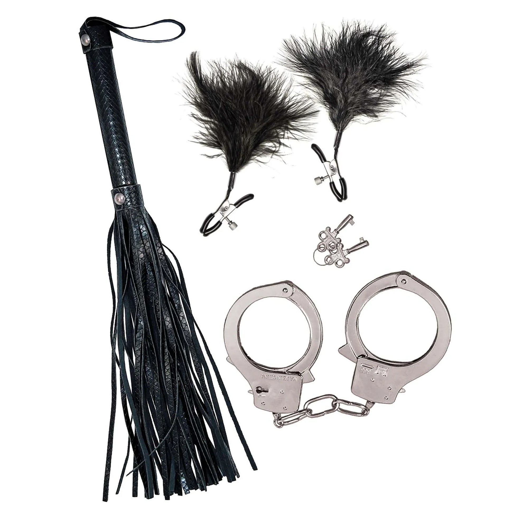 Bondage By Nasstoys Kit Black. Introducing the Nasstoys Bondage Kit: the perfect blend of playful exploration and thrilling sensations, designed especially for beginners. Unleash your desires and dive into the world of bondage with confidence, courtesy of this thoughtfully curated kit. Whether you are a newcomer to the world of bondage or a seasoned explorer, the Nasstoys Bondage Kit is an excellent choice for those seeking a gentle introduction. Discover the excitement of restraint and sensory play with this carefully crafted set. Experience the thrill of being bound with the included quick release metal handcuffs. These cuffs provide a secure yet easily removable restraint, ensuring safety and comfort throughout your playtime. Elevate your sensory experience with tantalizing nipple clamps adorned with soft red feathers. Perfect for adding an extra layer of sensation, these clamps allow you to explore the delightful balance between pleasure and a gentle, teasing touch. Unleash your inner desires with the faux leather flogger, designed to deliver a satisfying combination of pleasure and playfulness. The gentle swish of the flogger against the skin adds an exciting element to your intimate moments. The Nasstoys Bondage Kit is compact and discreet, making it an ideal companion for travel or spontaneous adventures. Bring a touch of excitement to any setting with this easily storable and transportable set. Features: Feathered nipple clamps. Faux leather spanking whip. Metal handcuff with cuffs. Phthalates free. Materials: Silicone, ABS Plastic. Size: Whip Size Length 1 foot, Width 1 inch, Height 15 inches, Nipple Clamp Sizes Length 1 inch, Width 2 inches, Height 6 inches, Handcuff Sizes Length 3.125 inches, Width 3.125 inches, Height 10.625 inches. Categories: Bondage, Fetish, Kink, Sex Toys for Couples, Whips, Paddles, Ticklers, Bondage, Fetish and Kink Kits, Cuffs, Sensual Kits. 2024.