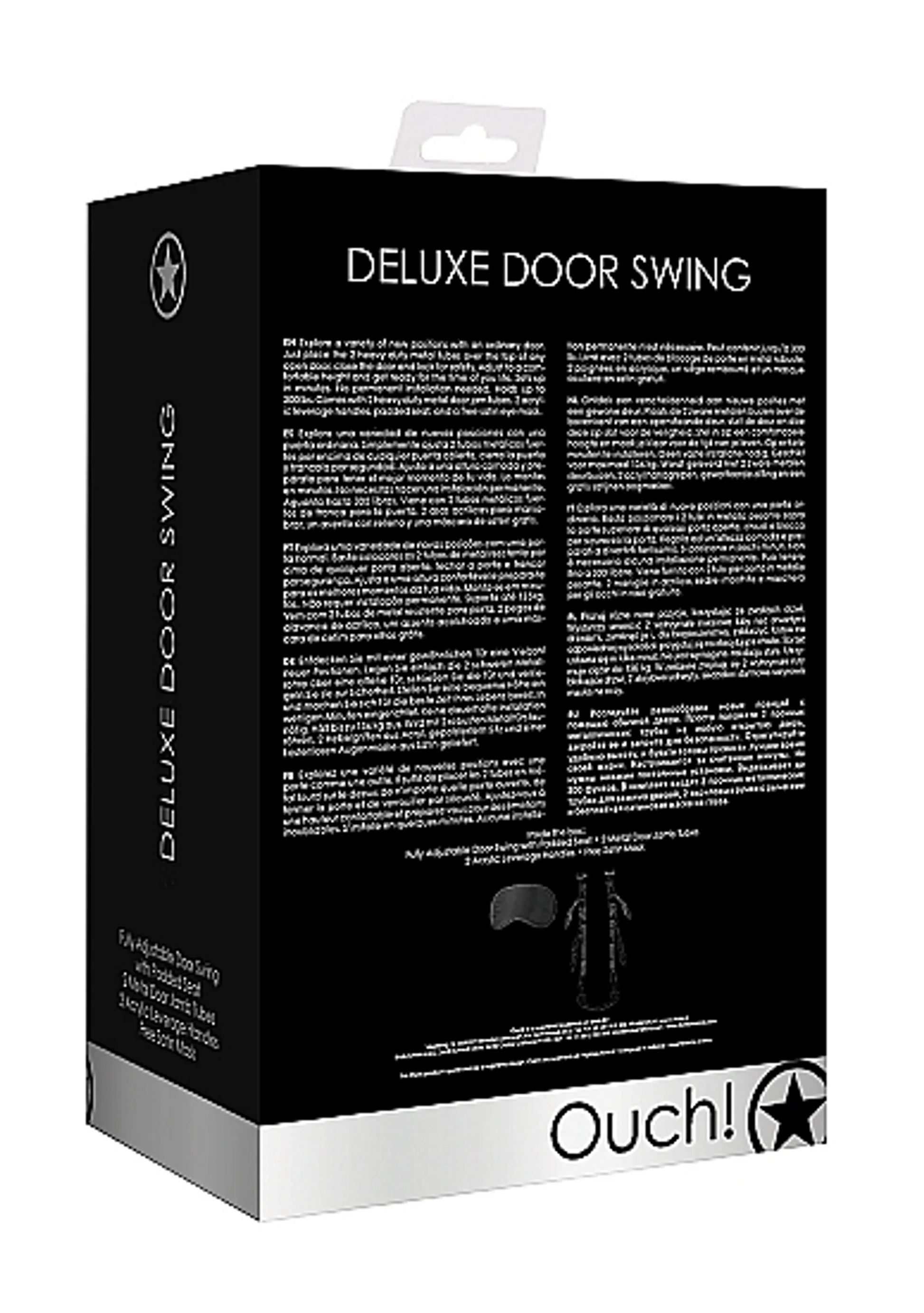 Ouch! Deluxe Door Swing Black from Shots Toys. Just place the 2 heavy duty metal tubes over the top of any open door, close the door and lock for safety. Adjust to a comfortable height and get ready for the time of you life. Sets up in minutes. No permanent installation needed. Holds up to 300 pounds. Comes with 2 heavy duty metal door jam tubes, 2 acrylic leverage handles, padded seat, and a free satin eye mask. Dimensions package 10.39 inches by 6.77 inches by 4.53 inches. Weight package 30.34 ounces. Product weight 1 pound.