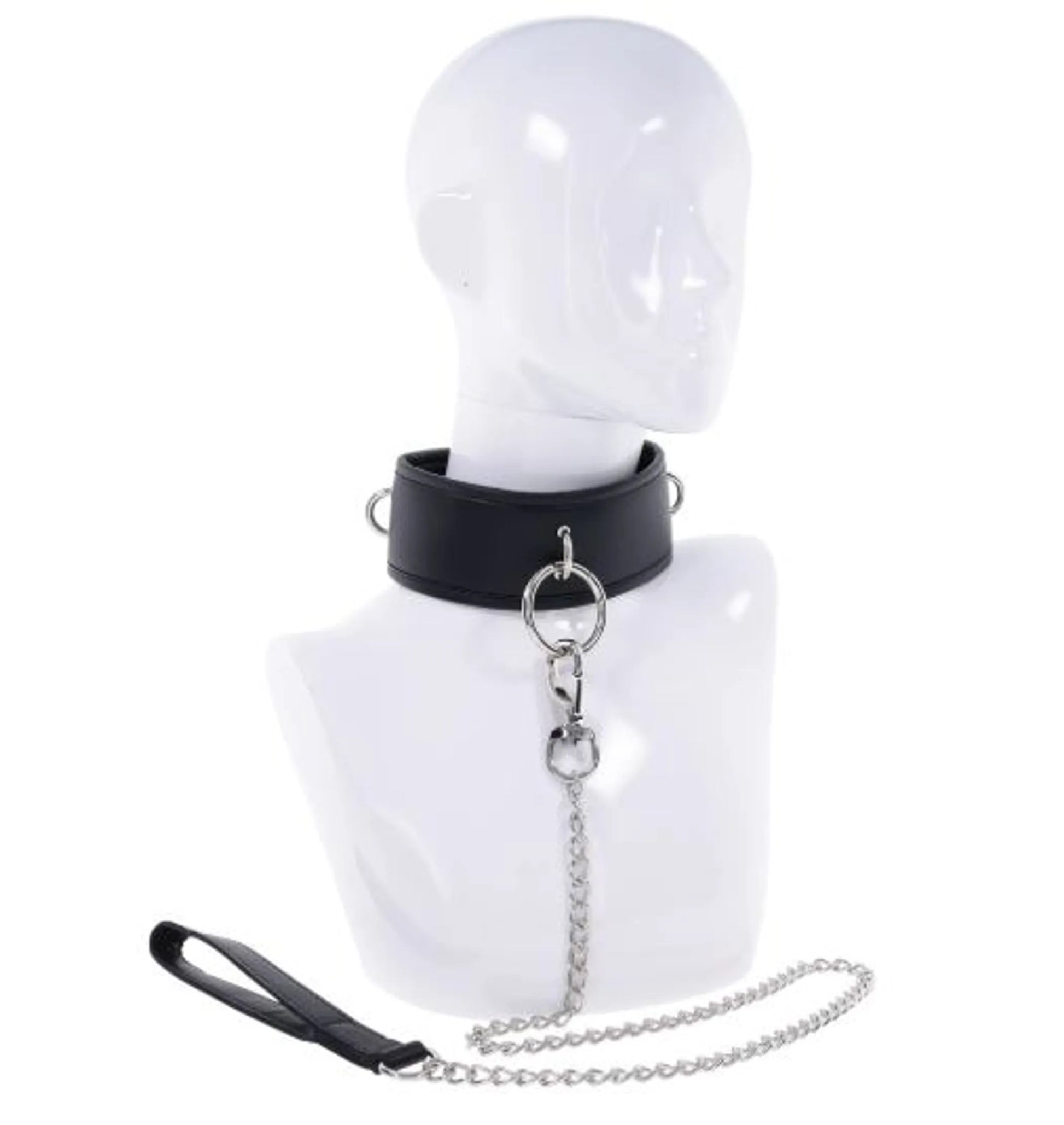 El cuero sintético negro se combina con elegante herrajes metálicos plateados, incluyendo un gran anillo central para sujetar la correa con facilidad. Con dos puntos de conexión adicionales a los lados, este collar permite explorar posiciones y restricciones más creativas.