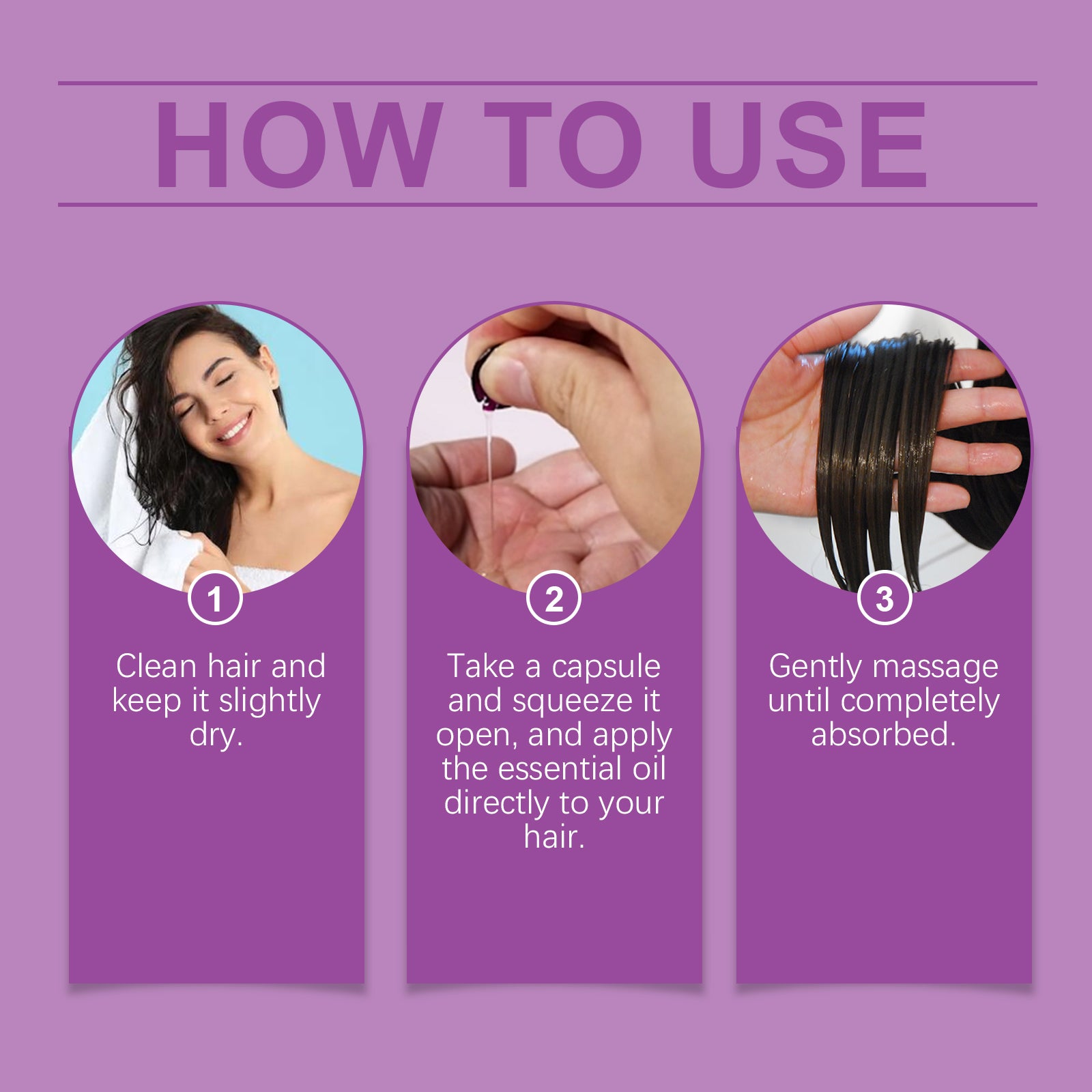Our Hair Essential Oil Care capsules (purple) contain argan oil, Jojoba seed oil, sunflower seed oil. It can deeply nourish hair, repair damaged hair and enhance hair toughness. The way to use it is simple: 1. Clean your hair and keep it slightly dry. 2. Take a capsule, squeeze it open and apply the essential oil directly to your hair. 3. Gently massage until completely absorbed. Locks in moisture, prevents dryness and frizz, and leaves hair smooth and shiny.