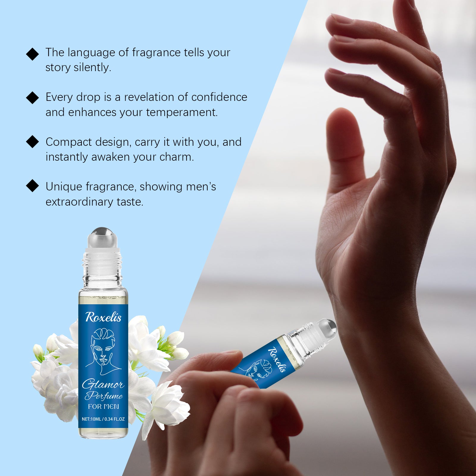 Our Glamor Perfume For Men contains Pogostemon Cablinleaf Extract, Cocos Nucifera(Coconut)Oil, Lavandula Angustifolia (Lavender) Oil. It can moisturize the skin while emitting natural fruit fragrance, balance mood, add mystery, ineffably enhance human interaction, broaden social boundaries, and show the unique charm of a gentleman. It's easy to use: Remove the lid, gently roll the ball perfume on your wrists, back of your neck, behind your ears and behind your knees, and wait for the scent to dissipate. The natural aroma soothes your mood and calms your mind.