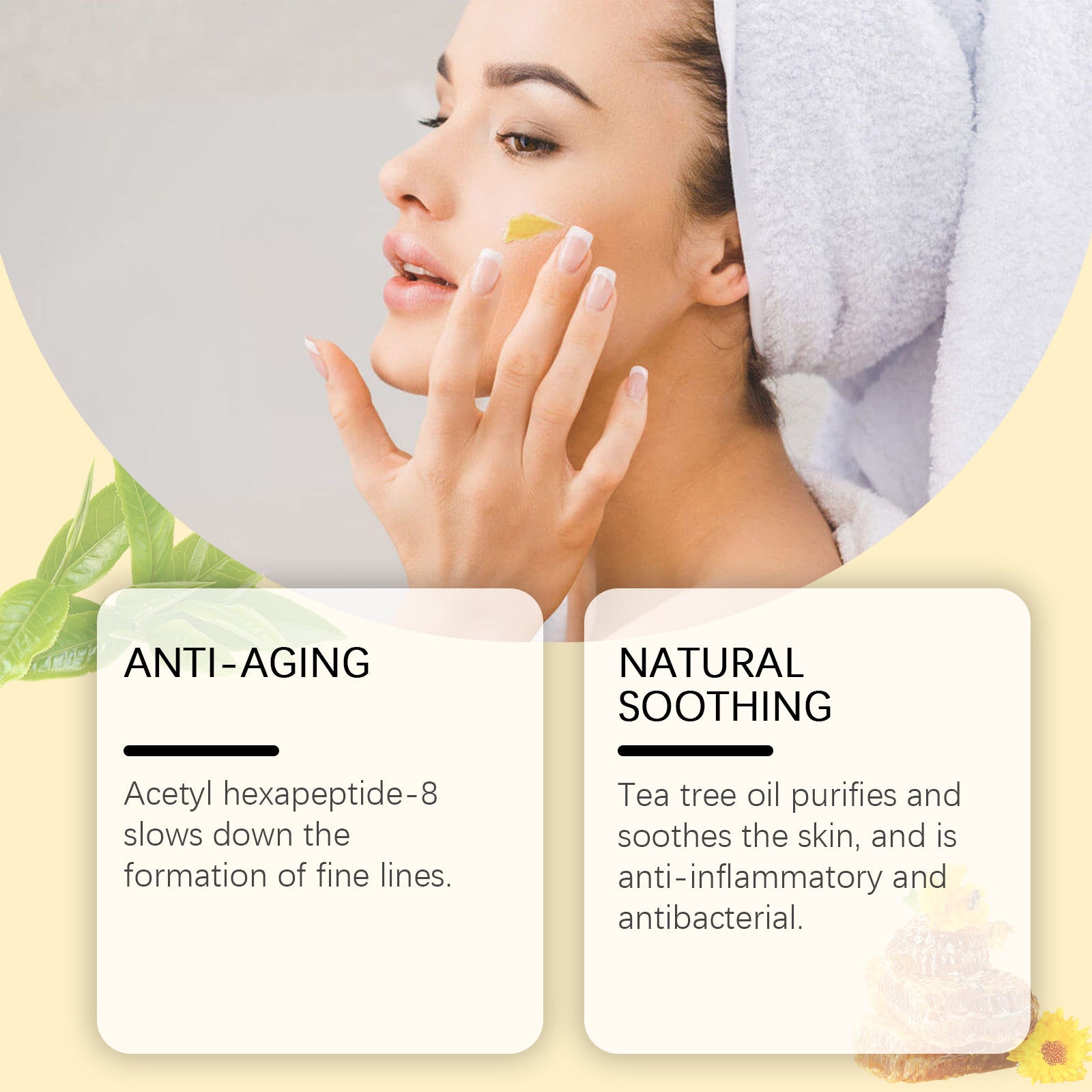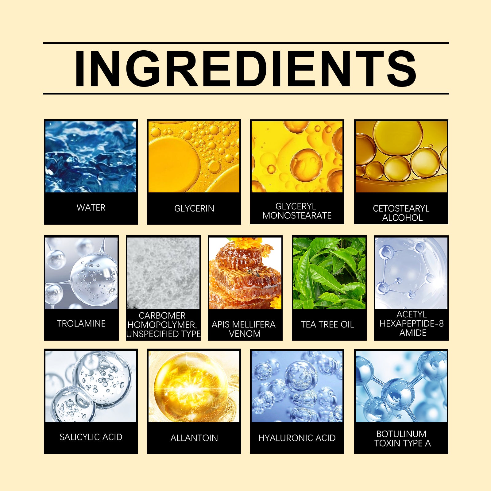 Our bee venom skin care cream contains bee venom and tea tree oil. It slows down the formation of fine lines. Tea tree oil purifies and soothes the skin and has anti-inflammatory and antibacterial effects. Its application method is simple: clean dry skin, apply appropriate amount of this product to the affected area, massage until absorbed. And the hyaluronic acid can lock in water for a long time and moisturize for a long time.