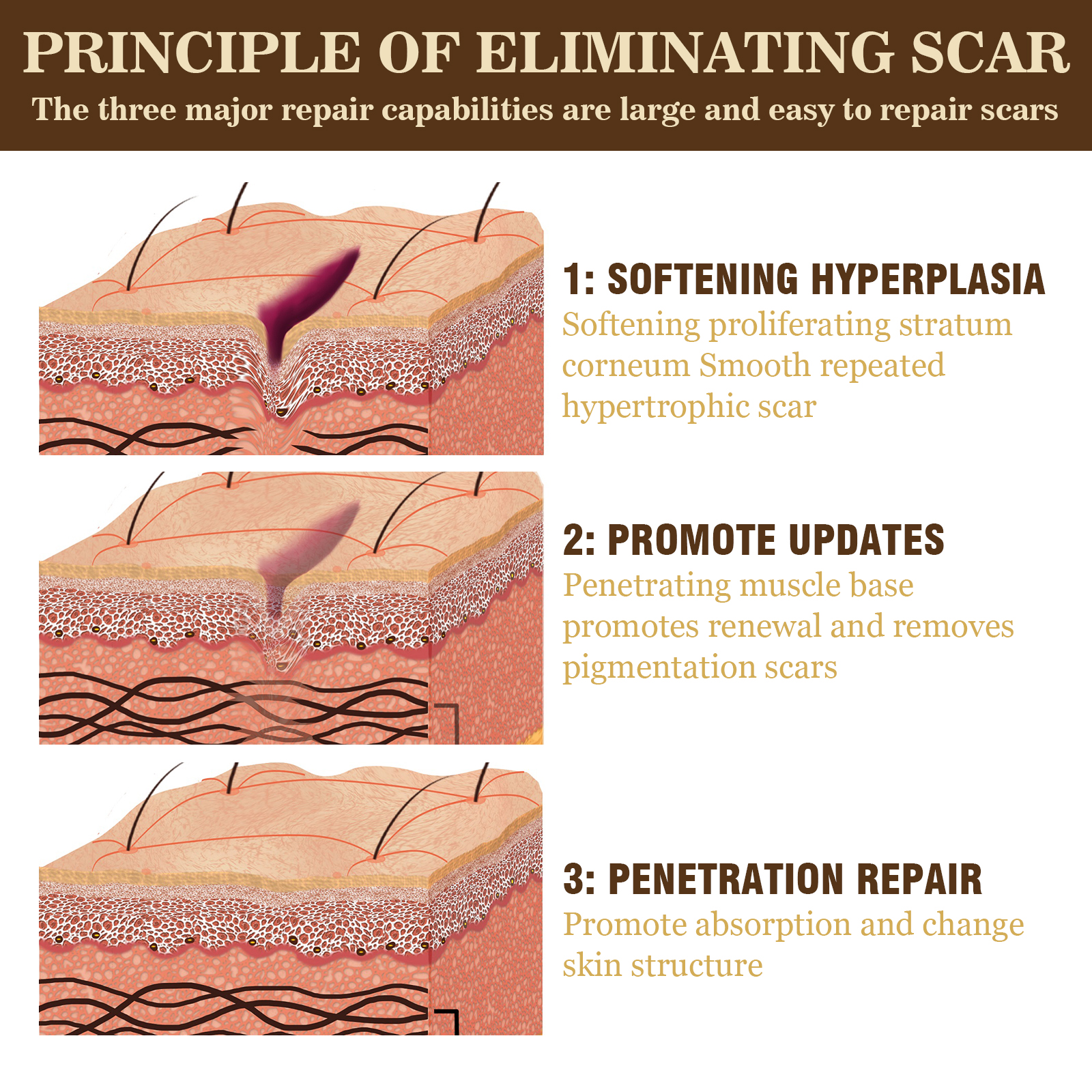 Our Scar essential oil contains carbomer, hydrolyzed collagen, and Centella asiatica extract. It can soften hyperplastic cuticle, smooth repeated hyperplastic scars, penetrate muscle base to promote renewal, remove pigmentation scars, promote absorption, and change skin structure. Its application is simple: clean around the scar, apply 1-2 drops of serum to the scar, and massage with your ring and middle fingers until it is fully absorbed. Promote metabolic cell growth, accelerate wound healing, soften tissue, repair cells, fight acne scars, whiten skin repair cells, fight acne scars.