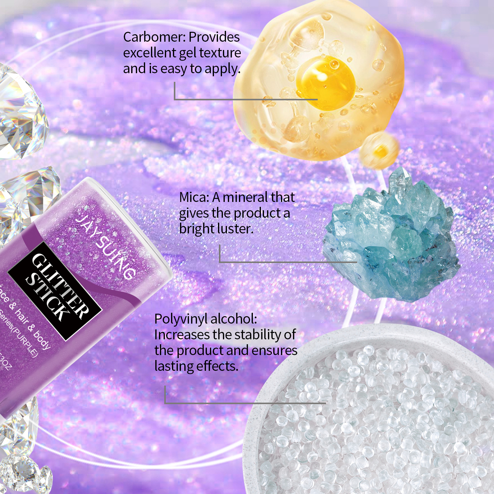 Our sequin flash rods (purple) are carefully formulated with glycerin, carbomer and mica. Designed specifically to enhance skin luster and keep sequins shiny and charming for a long time. The usage method is extremely convenient: 1. Open the lid, rotate the top knob, and unscrew the paste. 2. Apply the sequin stick evenly and directly to the body, hair, face, including the skin around the eyes and other areas you want to decorate. And add shiny mica to instantly enhance your personal charm; Suitable for all kinds of social occasions and for sensitive skin.