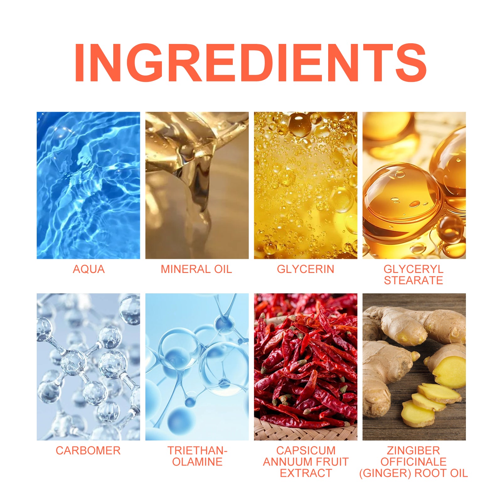 Our body care cream contains hyaluronic acid, ginger root extract and aloe vera leaf extract. It can help burn fat, improve sagging skin, make the skin firm and smooth, deeply relax muscles and reduce muscle fatigue. Its usage method is very simple: Apply the product as a body cream to the arms, waist, abdomen, thighs and legs until fully absorbed. Apply it twice a day. After 15 minutes, you will feel warm. If you feel the heat is not enough, you can cover your body with cling film to increase the effectiveness of the gel. It helps burn fat, lose weight, make you look slimmer and help you become more confident.