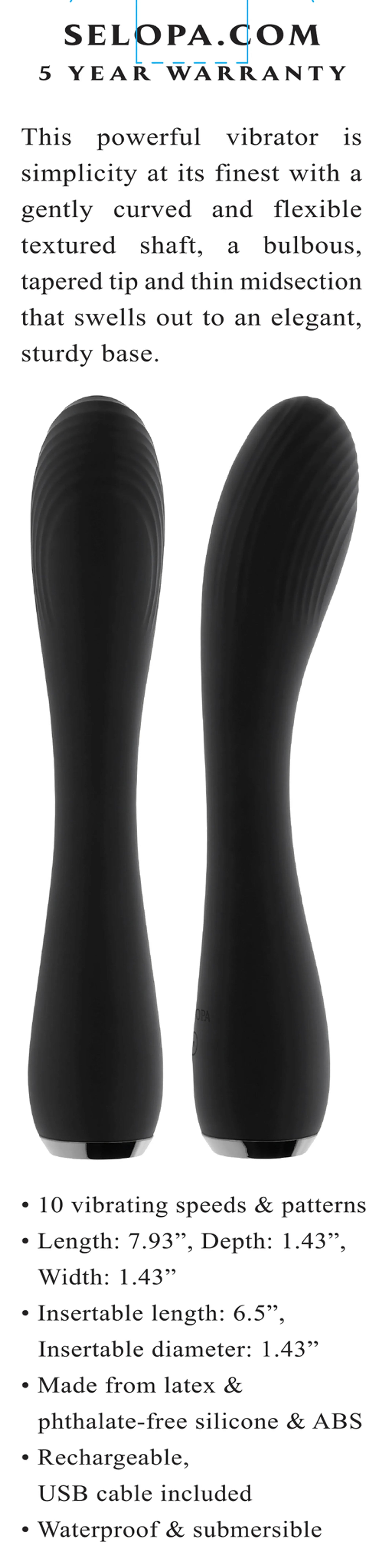 Este poderoso vibrador combina simplicidad y elegancia con un eje ligeramente curvado y flexible, una punta bulbosa y cónica, y una sección media delgada que se ensancha hasta una base elegante y resistente.