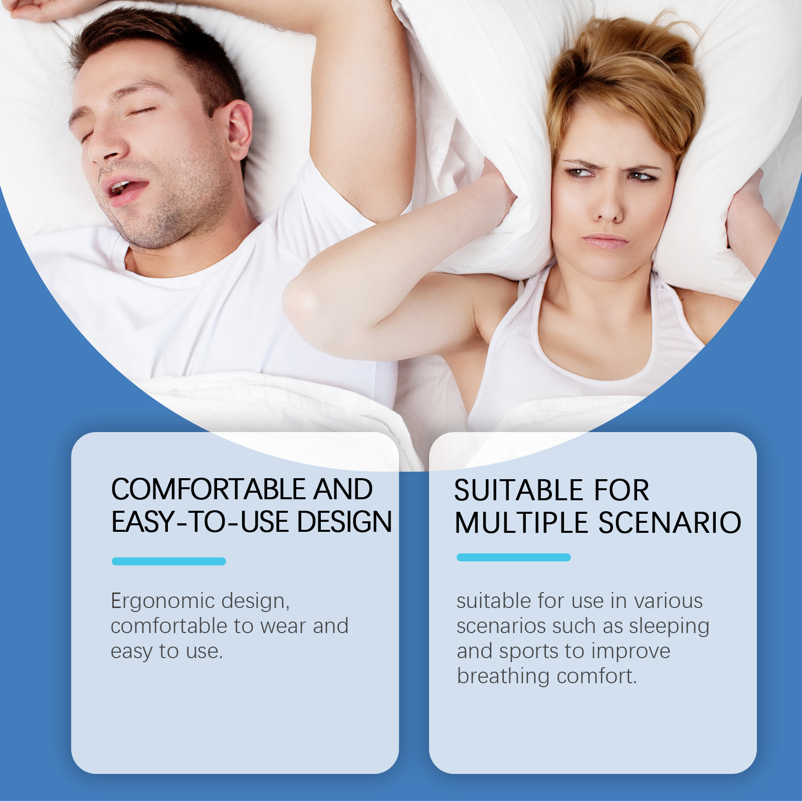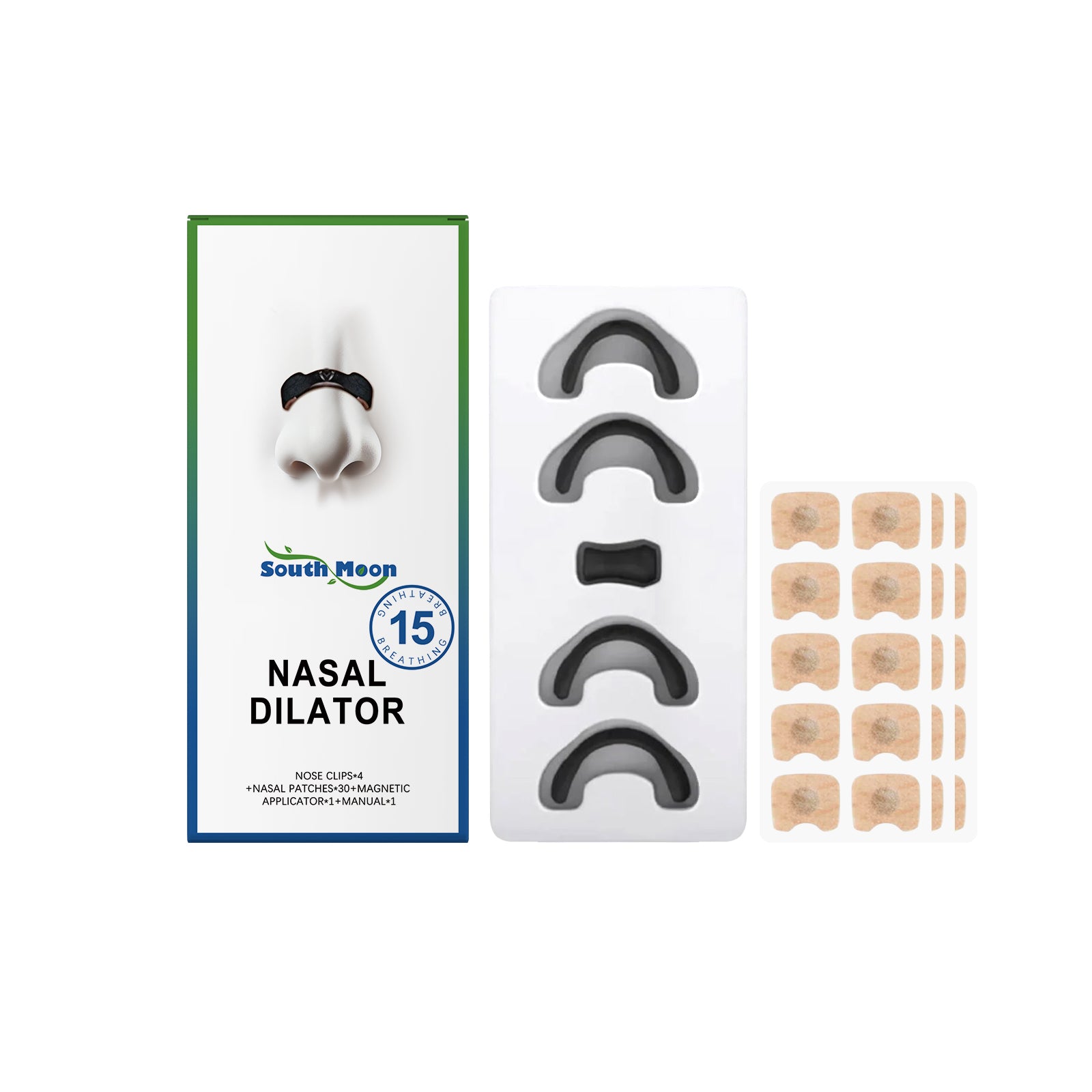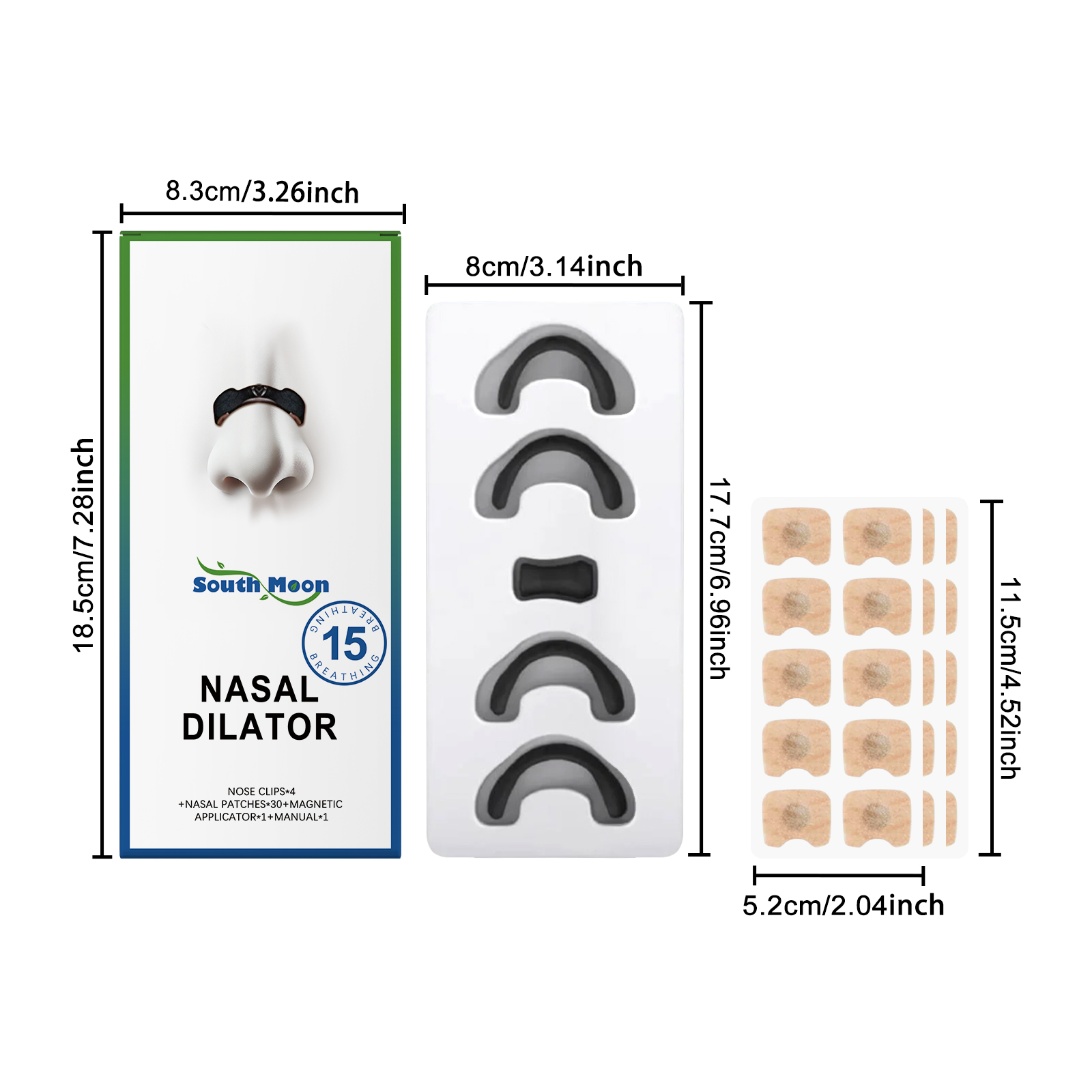 Our nose care kit contains non-woven, polypropylene. It can be ergonomic design comfortable to wear and easy to use. Suitable for a variety of scenarios, such as sleep and exercise, to improve breathing comfort. The method of application is simple: thoroughly clean and dry the skin of the nose area using a magnetic suction device to hold the nose patch, remove the protective film on the back of the nose patch, apply the nose patch to one side of the nose, press and smooth the nose patch, and repeat on the other side. Finally, use a nose clip to clamp the patch and secure it to your nose. And can significantly reduce snoring and improve sleep quality.