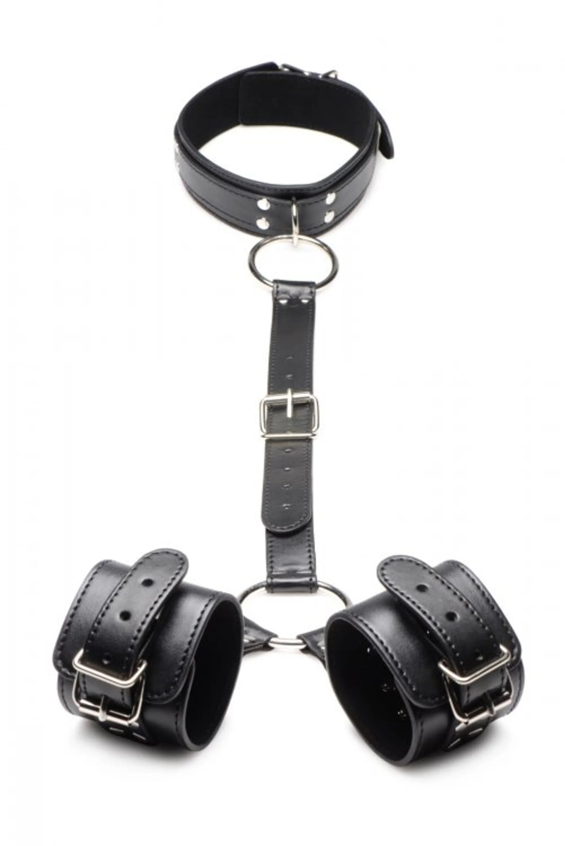 Los grandes anillos en O están hechos de metal resistente libre de níquel y permiten unir otros accesorios de bondage. Usa la hebilla para ajustar al tamaño perfecto. Engancha tus dedos a los anillos O y atrae a tu amante hacia ti. Prueba conectando los anillos a distintos puntos de anclaje o coloca sus manos lejos de su alcance. Sus muñecas quedarán esposadas y restringidas, con la correa central unida al collar del cuello.
